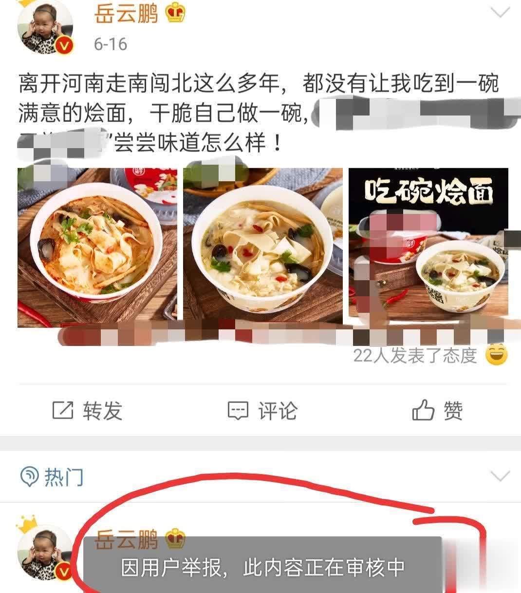 前几天看岳云鹏的动态,发现他家的小店有烩面出售,由于小小特别喜欢吃烩面,就忍不住想在评论区评头论足一番,没想到,点开评论,弹出的却是:因用户举报,该内容正在审核中。